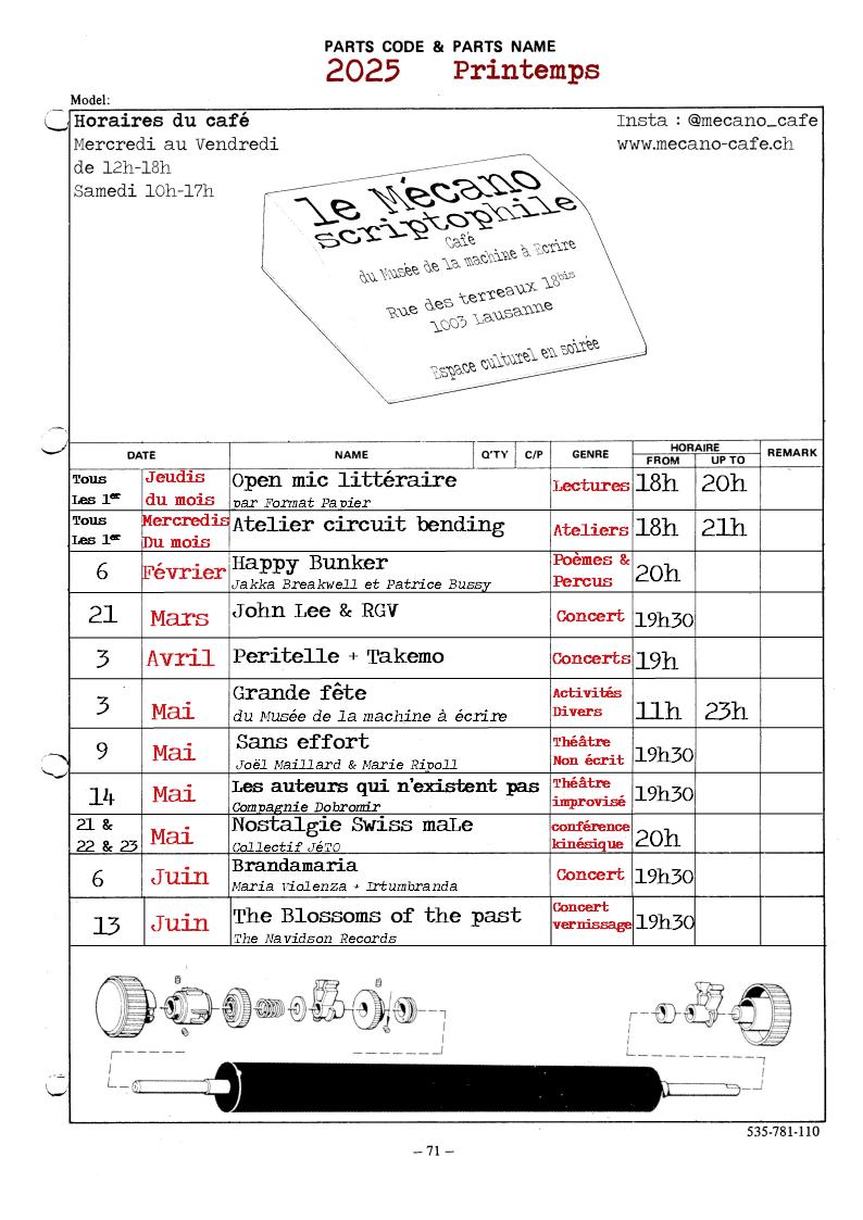 Anniversaire de la première année du MMàE, avec une programmation musicale orchestrée par Hummus Records, une conférence LOGITECH sur l’innovation des claviers, des concerts, un concours de dactylographie, dans laquelle le Mécanoscriptohile a pris en charge l’accueil des intervenants et la restauration sur toute la journée. Nous avons pu inviter : - « Le sabbat de la mandragore et les portes de la lumière », par Gerry Oulevay et Bastien Conus - Ilajan, chanteuse pop - folk - Stéphane Block