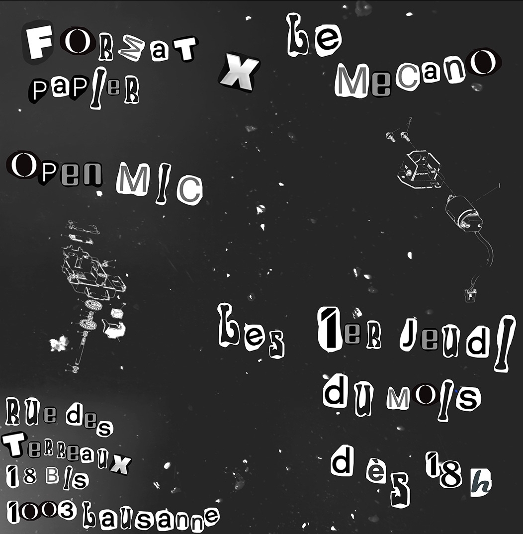 Format Papier, c'est Alice, Jessy, Leo et Marc, quatre humains plein d'envies. L'envie la plus profonde, celle qui les unit, c'est de rassembler tout un monde par des textes, des photos, des tableaux ou des images. Format Papier, c'est une petite maison d'édition lausannoise, où l'on vient vider son appareil, ses cahiers, ses carnets ou les notes dans son téléphone. Mais comme tout cela reste encore terriblement distant, Format Papier, c'est tout bientôt une soirée haute en émotions, que l’on nommera open-mic littéraire. Pour que les mots vivent, soient lus à haute voix et viennent se glisser dans les têtes - les coeurs.